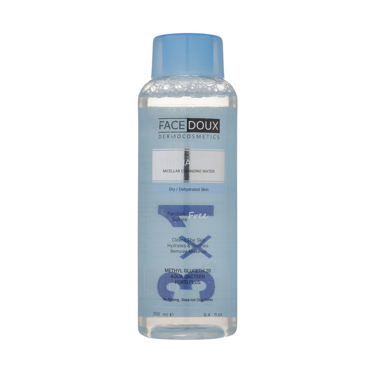 محلول پاک كننده صورت مخصوص پوست های خشک و آكنه ای هیدرازوم فیس دوکس این محلول پاک کننده آرایش یا میکاپ ریموور مناسب پوست خشک و مختلط و پوست های آکنه ای است. میسلار واتر آکنه زوم فیس دوکس نیاز به آبکشی ندارد و در موقعیت های حساس که دسترسی به آب وجود ندارد و یا اینکه فرد بیمار بستری شده است بهترین گزینه برای پاک کردن پوست است. این میسلار واتر دارای PH فیزیولوژیک نزدیک به پوست و بدون نیاز به آبکشی است.