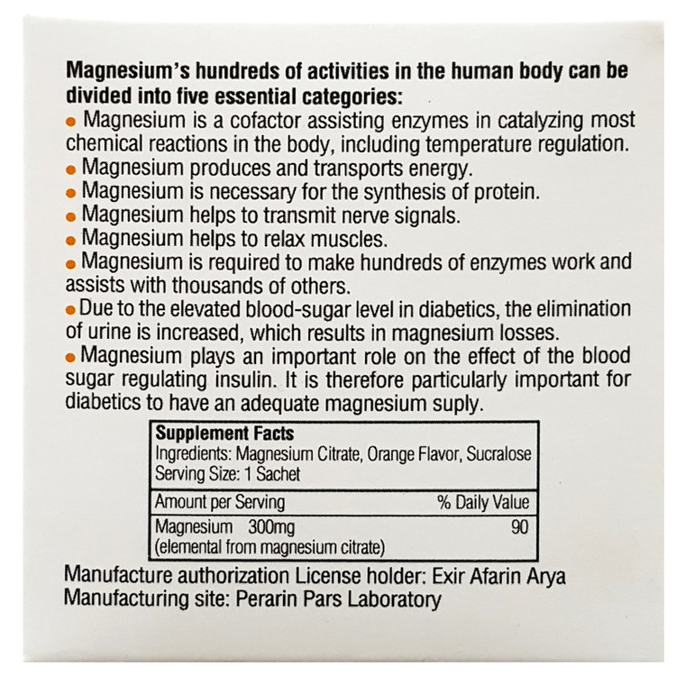 حاوی 300 میلی گرم منیزیم (سیترات) در هر ساشه کمک به سلامت سیستم عصبی و عضلانی کمک به کاهش اسپاسم عضلانی
