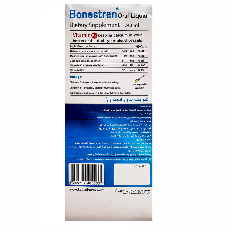 سایر توضیحات: حاوی کلسیم، منیزیم، روی، ویتامین D3 و ویتامین K2