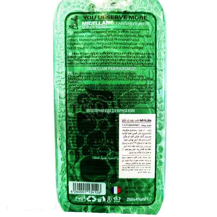 میسلار واتر لیاشو حاوی آلوئه ورا، محصولی حرفه ای برای پوست های مختلط، چرب و حساس است که با حجم 250 میلی لیتر، تا 150 بار قابل استفاده می باشد. پاک کننده آرایش Micellar لیاشو مخصوص پوست چرب بوده و مانند آهنربا، باقیماندههای آرایش و چربی مانده در پوست و آلودگیهای پوستی را پاک میکند. میسلار لیاشو با پاک کنندگی ملایم، بدون ایجاد چربی و سنگینی و با تمیز کردن کامل منافذ پوست، باعث کنترل چربی پوست و نرمی و لطافت آن میشود. محلول پاک کننده پوست چرب و مختلط لیاشو LIASHU از درخشان کردن پوست جلوگیری کرده و ظاهری مات به آن میبخشد.