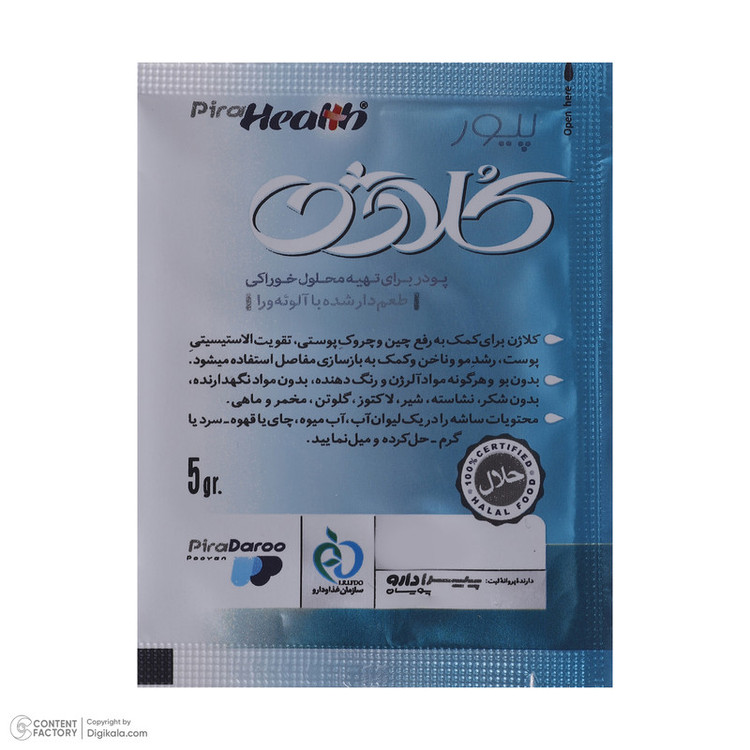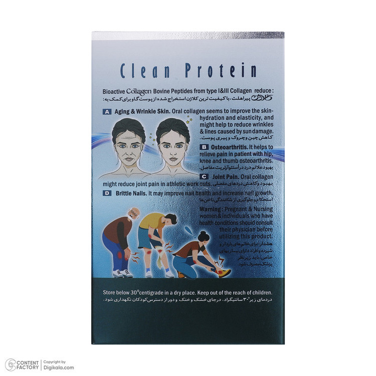 بدون بو، مواد نگهدارنده، فاقد شکر، لاکتوز، گلوتن، مخمر و ماهی استحکام و جلوگیری از شکنندگی ناخنها بهبود علائم درد در استئوآرتریت مفاصل هر ساشه حاوی ۵ گرم محلول خوراکی کاهش چین و چروک و پیری پوست بهبود و کاهش دردهای مفصلی هضم راحت