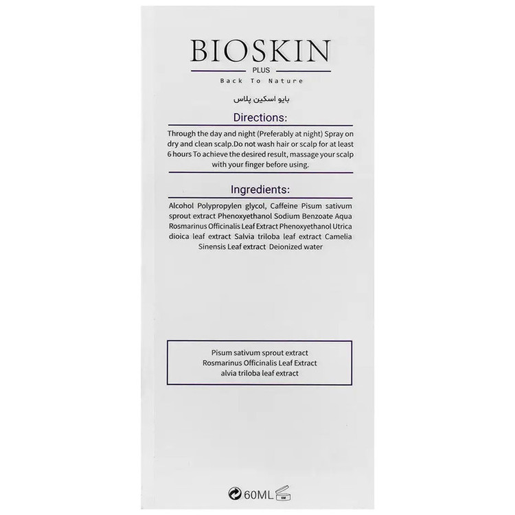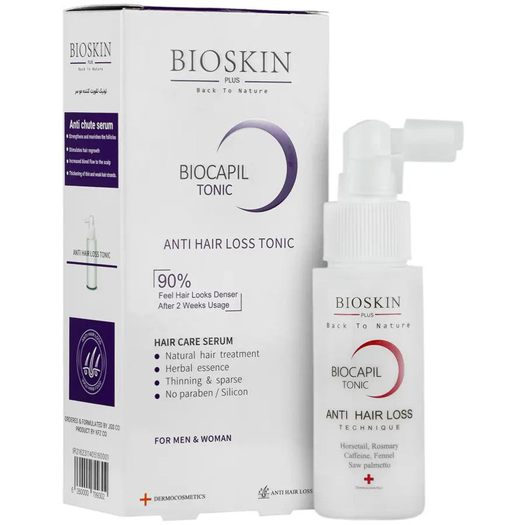 تونیک بایو اسکین بایوکپیل یک تونیک ضد ریزش مو و سرم مراقبت از مو از برند بایو اسکین است که با هدف تقویت فولیکول های مو، بازگشت فولیکول های مو به فاز رویش و افزایش جریان خون در کف سر در بسته بندی بطری پلاستیکی اسپری دار به حجم 60 میلی لیتر برای بانوان و آقایان بالای 14 سال تولید می شود. اسپری بایو اسکین با بهره گیری از مواد موثر استیل تترا پپتید-3 و عصاره شبدر قرمز در قالب یک کمپلکس نوین به نام کپیکسیل موجب تقویت تارهای مو و جلوگیری از ریزش آن ها می شود. از طرف دیگر، اسپری Bio Skin حاوی عصاره گیاه رزماری است که به تقویت کننده مو مشهور است و در کاهش ریزش مو و تقویت فولیکول های آن با تحریک گردش خون تاثیرگذار است. هم چنین، هیر تونیک بایو اسکین بایوکپیل به کمک عصاره گیاه رازیانه و خاصیت آنتی اکسیدان ناشی از آن، از تارهای مو در برابر رادیکال های آزاد و واکنش های اکسیداتیو محافظت می نماید و در رشد سریع مو با تحریک فولیکول ها تاثیر می گذارد. تونیک موی بایو اسکین دارای کافئین نیز می باشد که با تحریک افزایش جریان خون در کف سر سبب افزایش غذا رسانی و تغذیه فولیکول های مو می گردد. تونیک ضد ریزش بایو اسکین حاوی عصاره گیاه دم اسب نیز است که دارای مواد مغذی مناسب و محرک رشد تارهای جدید مو می باشد. تونیک مو بایو اسکین بایوکپیل دارای عصاره گیاه نخل اره ای نیز می باشد که در کنترل ریزش موی آندروژنیک (هورمونی-ارثی) به کمک اسید های چرب موجود در خود موثر است، الگوی طاسی را بهبود می بخشد و ضخامت تارهای مو به ویژه تارهای نازک را افزایش می دهد. لازم به ذکر است که تونیک ضد ریزش مو بایو اسکین پلاس یک محصول گیاهی ارگانیک، فاقد پارابن و سیلیکون است و بر اساس گزارش مصرف کنندگان این محصول، 90% از مصرف کنندگان شاهد افزایش تراکم در موهای خود پس از دو هفته مصرف شده اند.
