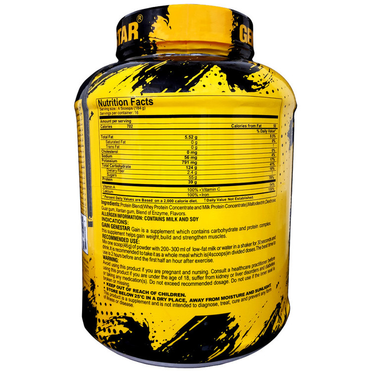 پودر گین افزایش وزن ژن استار محصولی منحصر به فرد پروتئینی – کربوهیدراتی است که تحت استانداردهای کیفی بالا فرموله و تولید شده است. آزمونهای بالینی نشان داده است که پس از تمرین، برای تحریک ساختن پروتئینهای ماهیچه ای، مخلوطی از پروتئین آب پنیر، اسیدهای آمینه و کربوهیدراتها بسیار موثرتر از مصرف کربوهیدراتها به تنهایی است. افزودن پروتئین به میکس اسید آمینه و کربوهیدرات، تاثیرات آنابولیک را نیز افزایش میدهد.