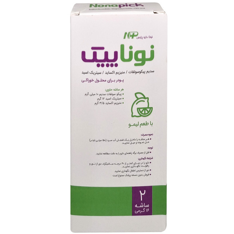 طعم لیمو افزایش حرکات دستگاه گوارش حاوی پیکو سولفات سدیم، اسید سیتریک، اکسید منیزیم کمک به پاکسازی روده جهت کولونوسکوپی، آزمایشهای پرتونگاری و جراحیهای شکمی یا رفع یبوست