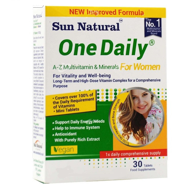 مولتی ویتامین و مینرال A-Z بانوان وان دیلی سان نچرال 30 قرص One Daily Multivitamin And Minerals For Women Sun Natural 30Tablets، دارای روغن گل مغربی و کوآنزیمQ10 و مواد معدنی و ویتامین های مورد نیاز بانوان می باشد. روغن گل مغربی در بهبود علائم سندرم پیش از قاعدگی از جمله درد های کمر و پستان ها مؤثر می باشد. این مولتی ویتامین و مینرال بانوان به افزایش انرژی و شادابی بانوان کمک کرده و به طور کلی در حفظ سلامت عمومی آن ها مؤثر می باشد.