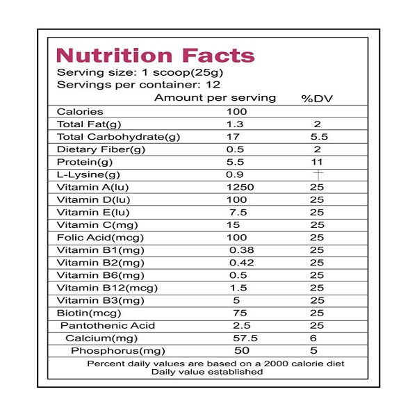 L-Lysine، Vitamin A، Vitamin D، Vitamin E، Vitamin C، Folic Acid، Vitamin B1، Vitamin B2، Vitamin B6، Vitamin B12، Vitamin B3، Biotin، Pantothenic Acid، Calcium، Phosphorus