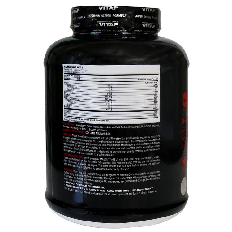 پودر مس ویت ویتاپی از تحلیل عضلانی جلوگیری نموده و برای افزایش وزن به ویژه برای ورزشکاران بسیار مناسب است. مخلوطی از پروتئینهای وی در کنار 12 نوع ویتامین در این محصول وجود دارد. در ابتدای دوره بدنسازی به منظور افزایش وزن و حجم عضلات میتوان این پودر را مورد استفاده قرار داد. این مکمل با طعمهای مختلف عرضه میشود و میتوانید آن را در آب یا شیر ریخته و مورد استفاده قرار دهید. جهت جلوگیری از تحلیل عضلانی این مکمل یکی از بهترین گزینهها است. در هر سروینگ این مکمل 886,2 کالری برای بدن شما تامین میکند. به جز ویتامینهای A، C، D و E املاح معدنی نیز در این مکمل موجود هستند که از جمله آنها میتوان به آهن، کلسیم و فسفر اشاره کرد. انواع اسیدهای آمینه را نیز در این محصول میتوانید بیابید.
