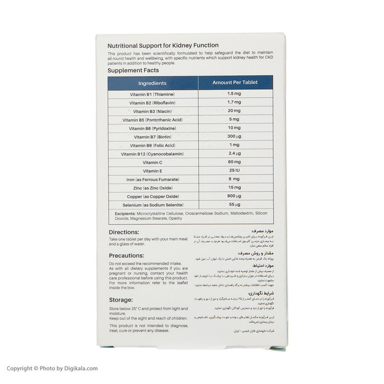 - تامین نیاز مغذی کلیهها در یک فرمولاسیون - پیشگیری و رفع کمبود ویتامینها و مینرالها در بیماران کلیوی (CKD) - همراه با سلنیوم، آهن و مس