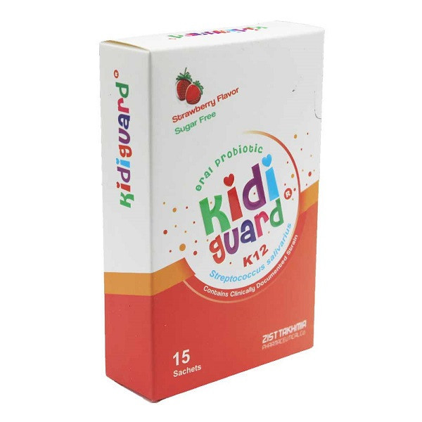 فلور میکروبی و پروبیوتیک ها:پروبیوتیک ها میکروارگانیسم های زنده ای هستند که در صورت مصرف به مقدار کافی، اثرات مفیدی بر سلامت میزبان دارند. به دلیل مفید بودن مصرف پروبیوتیک ها در تنظیم فلور میکروبی دستگاه گوارش، دانشمندان به فکر تولید یک پروبیوتیک دهانی جهت پیشگیری یا درمان بیماری های ناشی از به هم خوردن تعادل میکروبی دهان افتادند. اس سالیواریوس K12 مهار کننده باکتری های دخیل در عفونت گوش میانی، گلو درد استرپتوکوکی و تنفس بدبو است و به طور فزاینده به عنوان یک پروبیوتیک برای کاهش وقوع این نوع عفونت ها مورد استفاده قرار می گیرد.پری بیوتیک ها:پری بیوتیک ها ترکیبات مکملی هستند که در روده کوچک هیدرولیز و جذب نمی شوند و به عنوان ماده غذایی در دسترس باکتری های فلور روده بزرگ قرار می گیرند، به صورت انتخابی رشد و فعالیت تعدادی از گونه های باکتریایی فلور گوارشی را تحریک میکنند و در نتیجه اثرات مفیدی بر سلامت میزان دارند. رایج ترین پری بیوتیک ها کربوهیدرات هایی با سایز های متفاوت می باشند و از انواع آن میتوان به فروکتوالیگوساکارید، اینولین و سوربیتول اشاره نمود. کیدی گارد چیست؟کیدی گارد یک ترکیب سین بیوتیک (پروبیوتیک + پری بیوتیک) مناسب برای نوزادان و کودکان و بزرگسالان می باشد و حاوی مقادیر بالایی از باکتری سودمند و ایمن استرپتوکوکوس سالیواریوس K12 به همراه سوربیتول به عنوان پری بیوتیک است. مطالعات نشان داده است که این سویه به دلیل توانایی بالا در اتصال به مخاط دهان انسان و کلونیزاسیون سریع تر و بهتر در میان سایر پروبیوتیک ها در حفظ سلامت گوش، حلق و بینی و تقویت سیستم ایمنی بدن دارد. سویه و پری بیوتیک به کار رفته در این محصول شامل موارد زیر می باشد:استرپتوکوکوس سالیواریوس K12 (10^9 CFU) و سوربیتول و مواد جانبی: مواد جانبی: سوکرالوز، هیدروکسی پروپیل سلولز، سیتریک اسید، کلوئیدال سیلیکون دی اکساید، طعم دهنده توت فرنگی و رنگ قرمز پونسو 4R این فرآورده فاقد گلوتن می باشد.