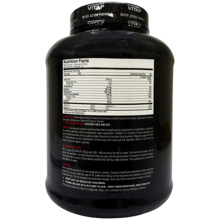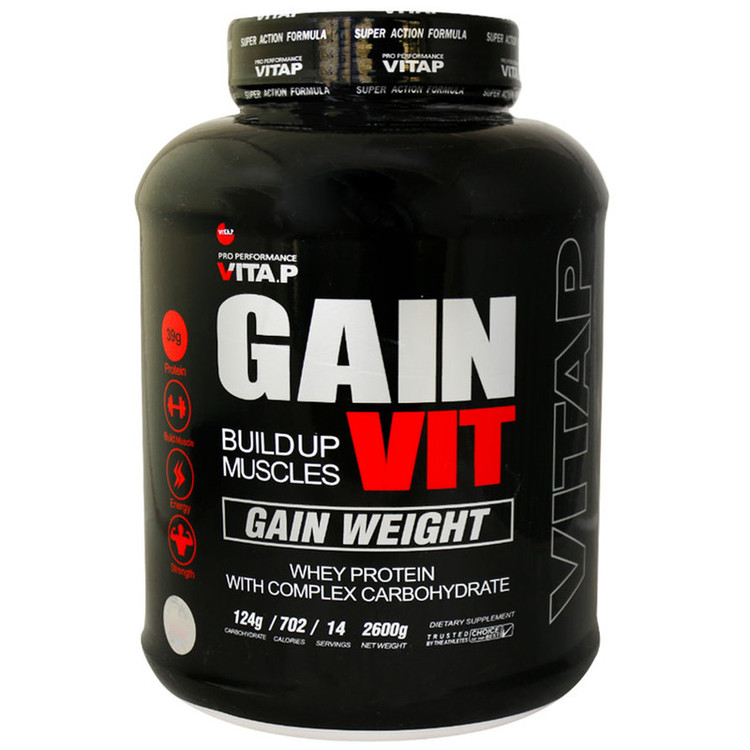 پودر گین ویت ویتاپی نوتریشن پروتئین، کربوهیدرات و انواع مواد معدنی مورد نیاز برای بدن را در خود جای داده است. این مکمل در هر سروینگ 720 کالری دارد و سرعت ریکاوری را نیز افزایش میدهد. آزمونهای بالینی نشان داده که پس از تمرین، برای تحریک ساختن پروتئینهای ماهیچهای، مخلوطی از پروتئین آب پنیر، اسیدهای آمینه و کربوهیدراتها بسیار موثرتر از مصرف کربوهیدراتها به تنهایی است. افزودن پروتئین به میکس اسید آمینه و کربوهیدرات، تاثیرات آنابولیک را نیز افزایش میدهد. این مکمل با طعم دلنشین دبل شکلات عرضه میشود و طرفداران زیادی دارد. استفاده از این مکمل به منظور افزایش وزن گزینه بسیار خوبی به شمار میآید. برای افزایش وزن کودکان نیز میتوان از این مکمل کمک گرفت اما بهتر است در این زمینه با متخصص تغذیه حتما مشورت صورت گیرد.