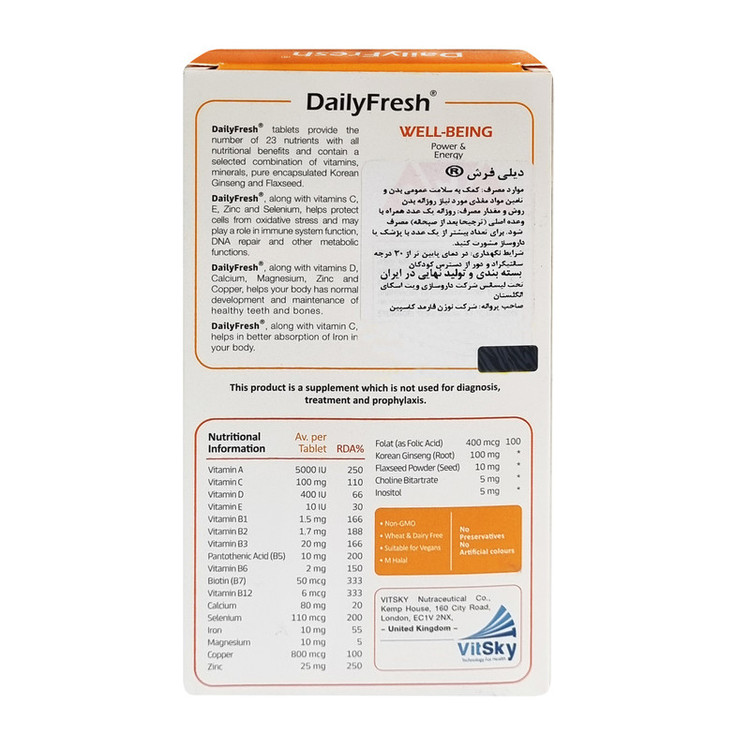 قرص daily fresh جهت حفظ سلامتی، تقویت سیستم ایمنی، تقویت حافظه و یادگیری، تامین انواع ویتامینها و مواد معدنی، تولید انرژی و کاهش خستگی مناسب است. کمبود هر کدام از این ویتامینها و مواد معدنی باعث مشکلات و بیماریهایی در بدن میشود. در مکمل دیلی فرش 23 نوع ویتامین و املاح معدنی ضروری برای بدن وجود دارد که به خوبی میتواند نیازهای روزانه فرد را برطرف کند.