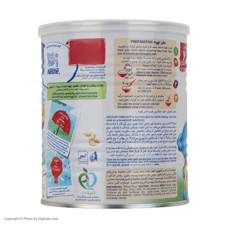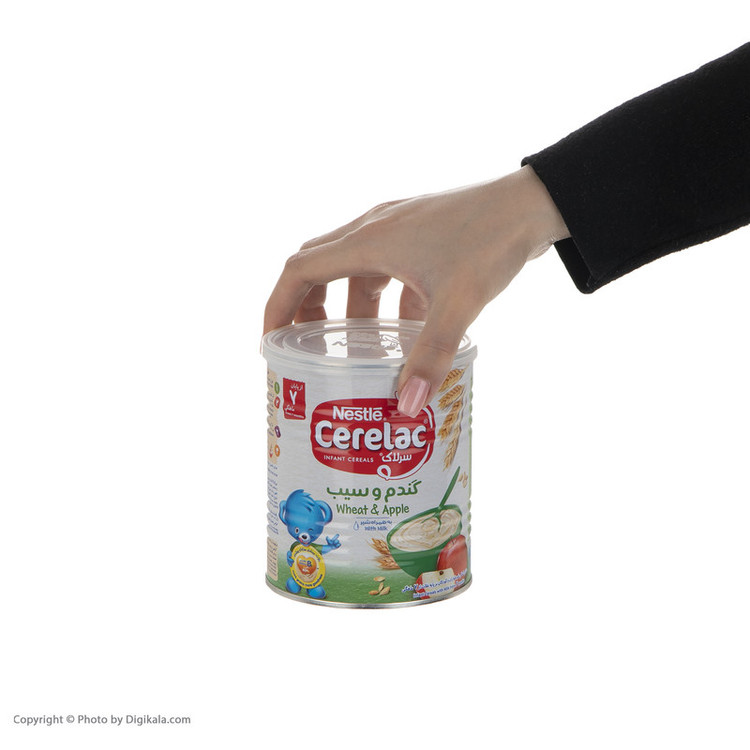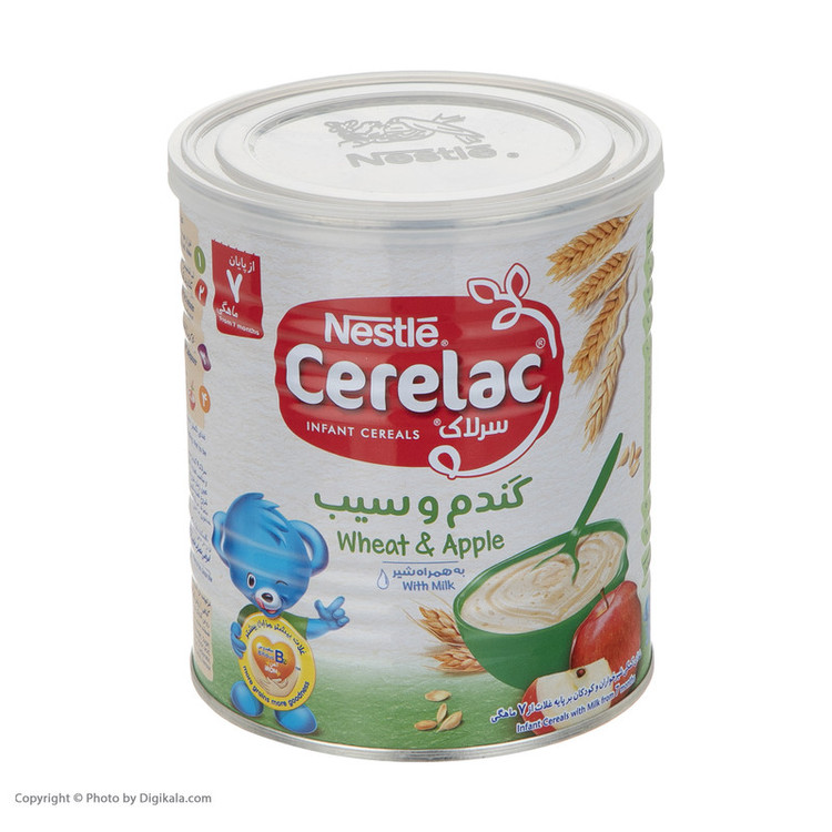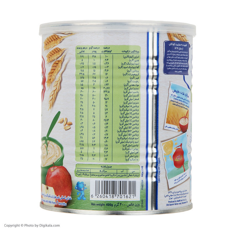 اجزای تشکیلدهنده: آرد گندم (گلوتن)، شیرخشک بدون چربی، شکر، مخلوط روغنهای گیاهی، پوره سیب، کربنات کلسیم، مخلوط ویتامینها و مواد معدنی