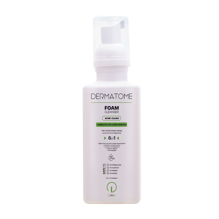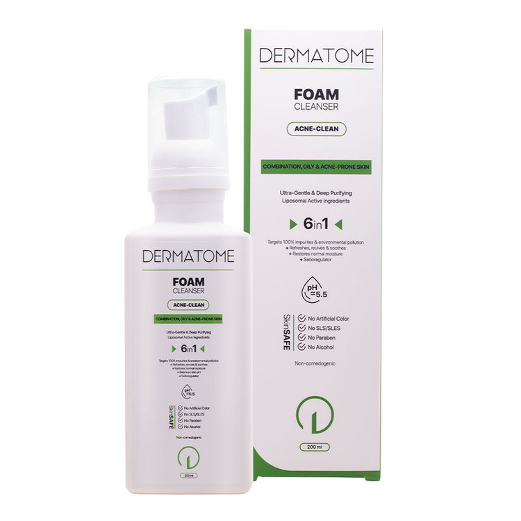 فوم پوست چرب و آکنه ای درماتوم محصول یک ترکیب غیر صابونی بوده و با به کارگیری تکنولوژی نوین در تولید محصولات مراقبت از پوست به نحوی طراحی و فرموله شده است تا هر گونه آلودگی موجود اعم از ذرات باقیمانده از آرایش، بقایای ناشی از آلودگی های محیطی و آلودگی های آب و هوا را 100% مورد هدف قرار داده و پاک نماید و همچنین چربی پوست را تنظیم کند. فوم پوست چرب و آکنه ای درماتوم نه تنها مانع ایجاد آکنه می گردد بلکه به نحو موثری آکنه های موجود را کاهش می دهد. فوم پوست چرب و آکنه ای درماتوم محصول پوشش اسیدی طبیعی پوست را محافظت نموده و رطوبت طبیعی آن را حفظ می کند. جهت به حداقل رساندن آسیب به ساختار طبیعی پوست ، این محصول فاقد هر گونه ترکیب آلرزی زا می باشد.