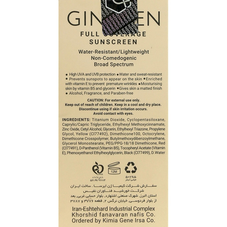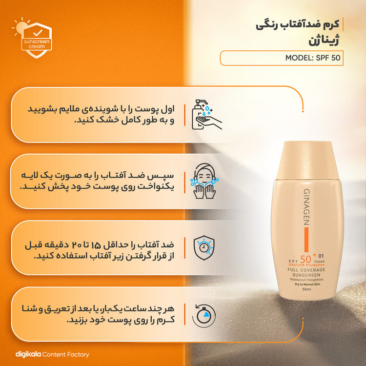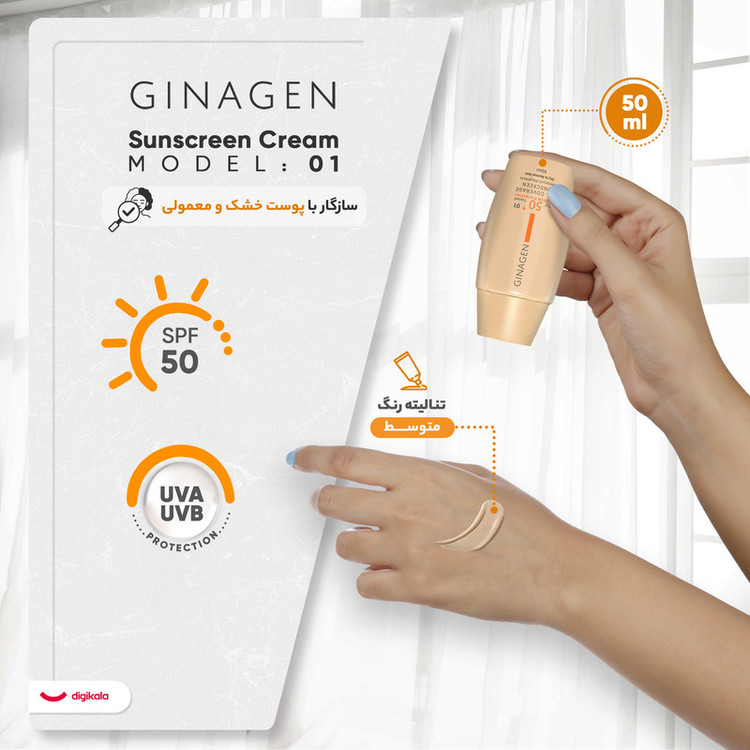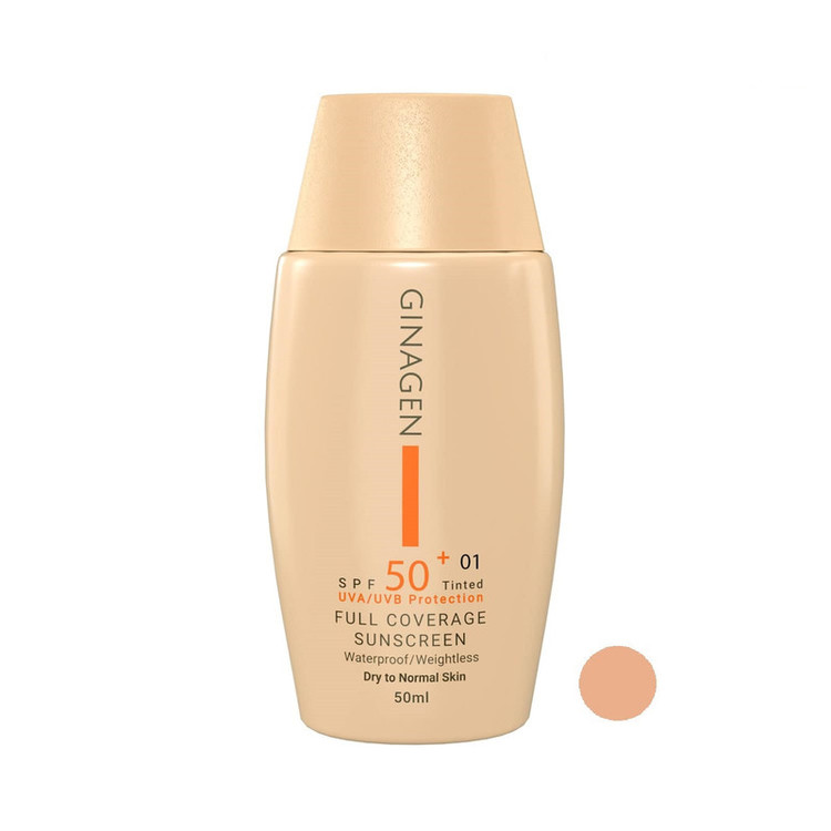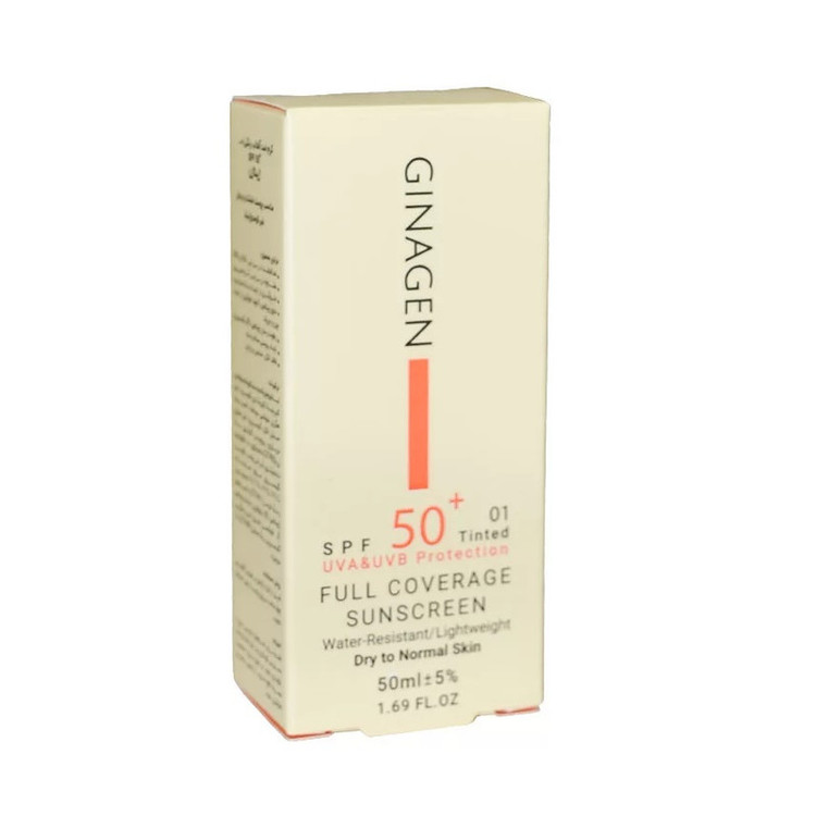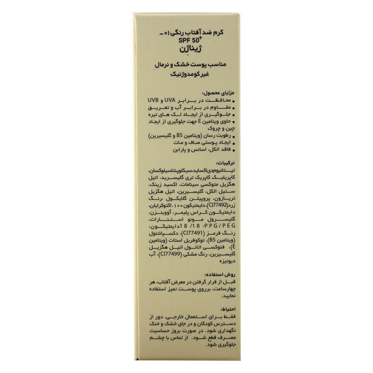 کرم ضد آفتاب رنگی ژیناژن، SPF 50، مدل 01، مناسب پوستهای خشک و نرمال با تنالیته متوسط و حجم 50 میلیلیتر، ضد آب، فاقد پارابن، محافظتکننده در برابر اشعههای UVA و UVB، ارای فرمولاسیون بدون الکل و گلیسیرین غنی شده با ویتامین E، با ماندگاری 4 ساعته