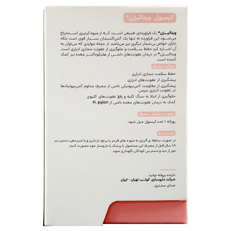 کپسول ویتالیژن ویتامدیک یک محصول کاربردی و چند منظوره است که به ویژه در بهبود و حفظ سلامت مجاری ادراری و دستگاه گوارش مؤثر است. این کپسول به دلیل ترکیبات طبیعی خود، بهویژه عصاره کرنبری، یکی از بهترین انتخابها برای پیشگیری از عفونتهای ادراری است. کرنبری به جلوگیری از چسبیدن باکتریها به دیوارههای مجاری ادراری کمک میکند و مانع از رشد آنها میشود. این ویژگی از نیاز به مصرف آنتیبیوتیکهای مداوم جلوگیری کرده و به بهبود وضعیت سلامت افراد مستعد به عفونتهای ادراری کمک میکند. یکی دیگر از مزایای این محصول، تأثیر آن در دستگاه گوارشی است. تحقیقات نشان میدهد که کرنبری و پروآنتوسیانیدینها میتوانند از اتصال باکتری هلیکوباکتر پیلوری به دیواره معده جلوگیری کنند. هلیکوباکتر پیلوری یکی از عوامل اصلی زخم معده و مشکلات گوارشی است و با کاهش فعالیت آن، سلامت گوارشی بهبود مییابد. این محصول میتواند برای افرادی که مشکلات مزمن معده و گوارش دارند، بسیار مفید باشد. از آنجایی که ویتالیژن دارای خواص آنتیاکسیدانی و ضد التهابی است، به بهبود عملکرد سیستم قلبی-عروقی نیز کمک میکند. پروآنتوسیانیدینها به عنوان یک آنتیاکسیدان قوی، از بدن در برابر اثرات مخرب رادیکالهای آزاد محافظت میکنند و به کاهش التهابات داخلی بدن کمک مینمایند.