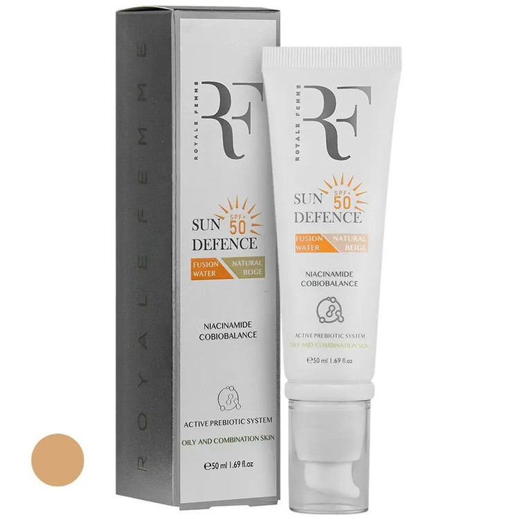 کرم ضد آفتاب رنگی آر.اف رویال فم SPF50 مدل Fusion water مناسب برای پوست چرب و مختلط حجم 50 میلی لیتر