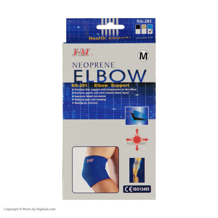 آرنج یک مفصل لولایی با تحرک بسیار بالا می باشد که در بیشتر کارهای روزانه و فعالبتهای ورزشی مورد استفاده قرار گرفته و آسیب دیدگی آن بسیار شایع است. یک راه درمان و یا پیشگری از آسیب دیدگی آن، جلوگیری از حرکت آرنج و یا تکان دادن آن به نرمی و آهستگی است، که به کمک آرنج بندهای طبی ممکن می شود. آرنج بند طبی آی ام مدل NS-201 از نئوپرن با کیفیت مرغوب تهیه شده است. این مدل از برند آی ام با اعمال فشار مناسب، مانع از حرکات اضافی آرنج و آسیبهای ناشی از فعالیت ورزشی و کار می شود؛ از سوی دیگر به صورت یک پارچه و کامل دور آرنج را گرفته و با حفظ گرمای بدن و افزایش گردش خون در قسمت آسیب دیده، منجر به تسریع روند بهبود و کاهش درد می گردد. با توجه به وزن سبک این محصول، هنگام فعالیتهای روزانه قابل استفاده می باشد. آرنج بند آی ام مدل NS-201 قابل شستشو بوده و استفاده از آن بسیار راحت و ساده می باشد.