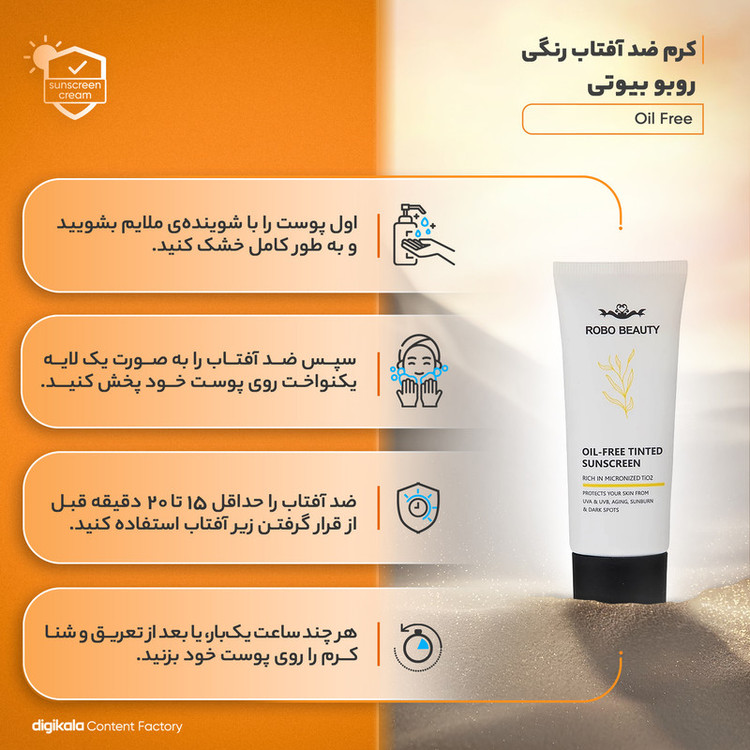 برند «روبو بیوتی» با تولید محصولات مراقبت از پوست، همیشه به دنبال ارائه راهکارهای نوین و کارآمد برای مشتریان خود است. محصول جدید این برند، «کرم ضد آفتاب رنگی مدل Oil Free» یک گزینه عالی برای افرادی است که از پوست چرب رنگی برخوردار هستند. این کرم ضد آفتاب رنگی، با دارا بودن فاکتور محافظتی بالای SPF 50، محافظت قوی و شدیدی را علیه اشعههای مضر خورشید فراهم میکند. این کرم نه تنها پوست شما را در برابر آفتاب محافظت میکند، بلکه با داشتن رنگ، به پوست شما زیبایی خاصی میبخشد.گفتنی است، کرم ضد آفتاب روبو بیوتی، با ترکیبی منحصر به فرد از مواد مغذی، پوست شما را نرم و لطیف میکند، در حالی که از آن در برابر آسیبهای خورشیدی محافظت میکند. همچنین با داشتن رنگ، میتواند به عنوان پایه آرایش نیز مورد استفاده قرار گیرد. با استفاده از کرم ضد آفتاب روبو بیوتی، همیشه از پوستی سالم و زیبا برخوردار باشید.