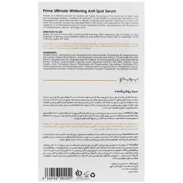 سرم روشن کننده پرایم با هدف کاهش لک و تیرگی برای انواع پوستها طراحی و تولید شده است. با فرمولاسیونی دقیق، این سرم از ترکیبات بسیار موثری نظیر 4-بوتیل رزورسینول، هگزیل رزورسینول و نیاسینامید برخوردار است تا با دقت و سرعت بالا به یکنواختسازی رنگ پوست کمک کند. تحقیقات علمی نشان میدهد که دادههای آزمایشگاهی و بالینی، ظرفیت مهار بالای 4-بوتیل رزورسینول بر آنزیم تیروزیناز را اثبات میکنند که نمایانگر قدرت بسیار بیشتر این ترکیب نسبت به هیدروکینون، آربوتین و کوجیک اسید است.