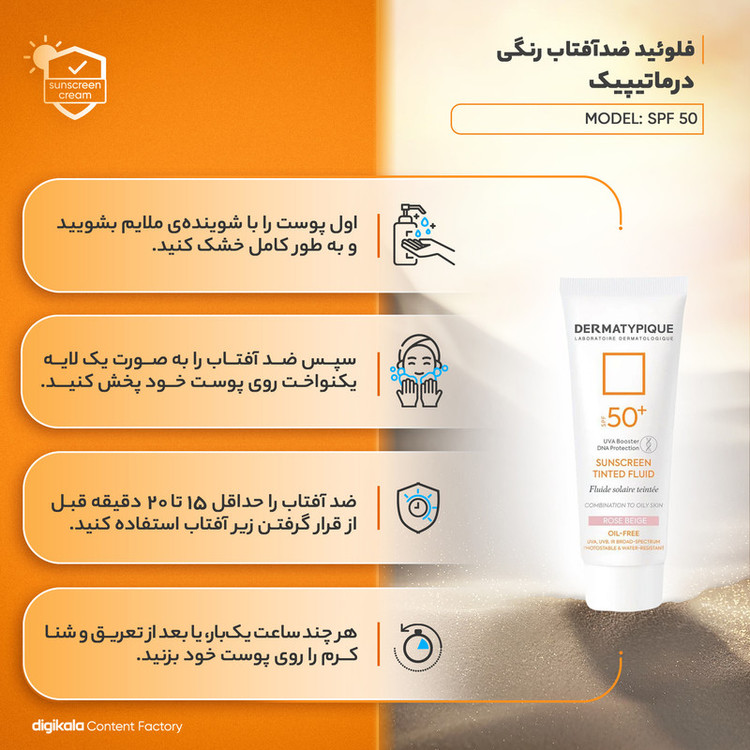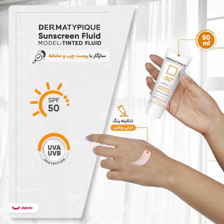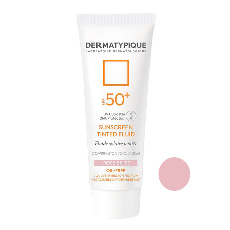 فلوئید ضد آفتاب رنگی رز بژ مناسب پوست چرب درماتیپیک SPF50، علاوه بر محافظت کامل پوست در برابر اشعههای مضر آفتاب، پوششی یکدست نیز روی پوست ایجاد میکند و نیاز شما به کرمپودر را رفع کرده است. این فلوئید ضد آفتاب با ترکیب منحصر بهفرد خود میتواند از DNA سلولی حفاظت کند و به این ترتیب از پیری زودرس پوست جلوگیری میشود. وجود مواد موثری مانند بیزابولول و نیاسینامید کمک میکند تا ترشح چربی پوست کنترل شود و براقیت پوست کاهش پیدا کند. فلوئید ضد آفتاب پوست چرب درماتیپیک ضد آب بوده و در برابر تعریق پوست مقاوم است.
