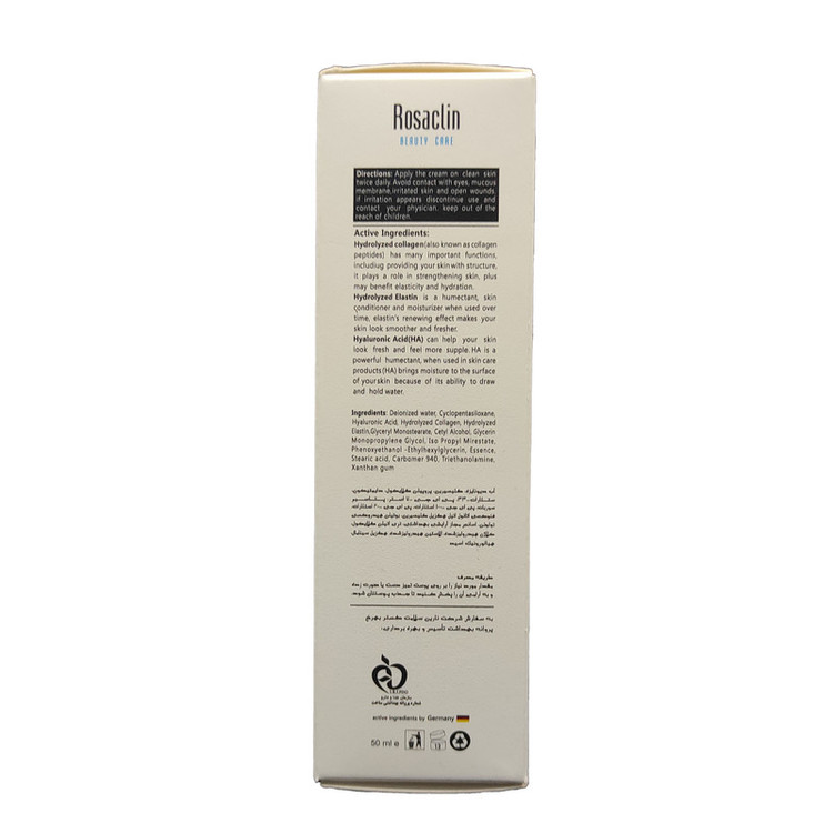 کرم آبرسان رزاکلین دارای هیالورونیک اسید، کلاژن والاستین است. با افزایش سن به مرور زمان پوست استحکام و شادابی خود را به دلیل تجزیه کلاژن، فیبرهای الاستیک و کاهش مواد مرطوب کننده خود که همان هیالورنیک اسید است را از دست می دهد. هیالورونیک اسید ترکیبی طبیعی ست که باعث شادابی و حفظ رطوبت پوست شده و بافت پوست را ترمیم می کند. کلاژن خاصیت ارتجاعی و آبرسانی به پوست صورت می بخشد و پوست را شاداب تر و سرحال تر نشان می دهد. الاستین نیز خاصیت نرم کنندگی و رطوبت رسانی دارد و بعد استفاده علاوه بر حفاظت صورت پوستی صاف تر و سرحال تر به ارمغان می آورد. از دیگر خواص این محصول این است که خاصیت بهبود چروک را دارد و از ایجاد آن نیز جلوگیری مینماید.