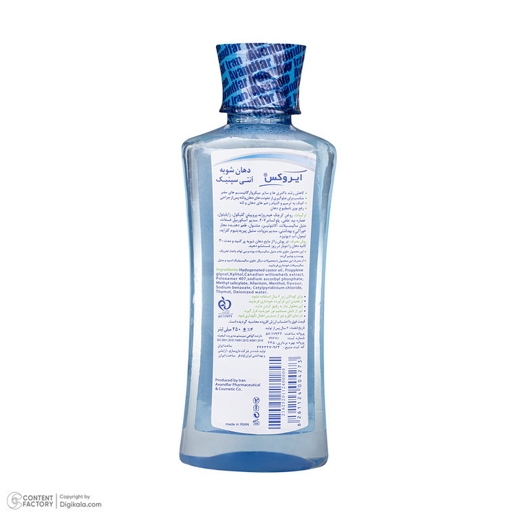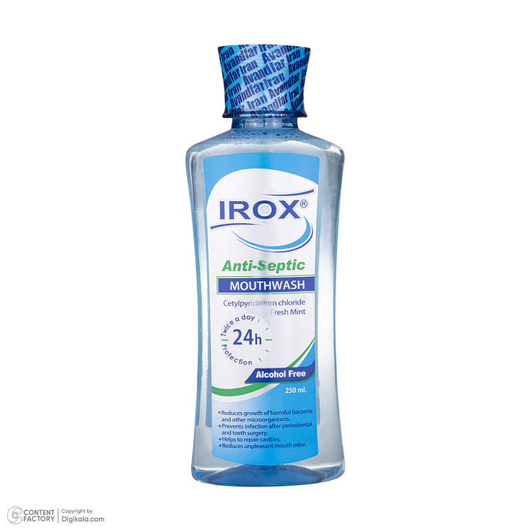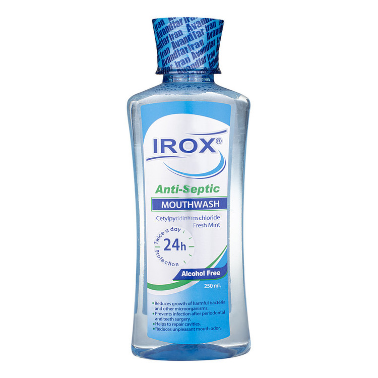 دهانشویه آنتی سپتیک ایروکس حاوی فلوراید و مواد ضدعفونیکننده میباشد که باعث کاهش رشد باکتریها و میکروارگانیسمهای مضر میگردد. دهانشویه آنتیسپتیک ایروکس برای جلوگیری از عفونتهای دهان و لثه بعد از جراحیهای دندان بسیار مؤثر و مناسب میباشد. دهانشویه آنتیسپتیک ایروکس با کاهش التهابات لثه و دهان و از بین بردن باکتریهای مضر باعث رفع بوی نامطبوع دهان شده و محیط دهان را خوشبو و مطبوع مینماید.دهانشویه آنتی سپتیک ایروکس به عنوان محصولی کمکی در کنار روشهای مکانیکی کنترل پلاک دندانی باعث از بین رفتن استرپتوکوکهای پاتوژن دهان می گردد. در کاهش و ترمیم زخمهای دهان و لثه و همچنین رفع آفتهای دهانی نقش بسیار مؤثری ایفا مینماید. این دهانشویه با فرمول خاص خود قابل رقابت با بهترین دهانشویههای خارجی میباشد.