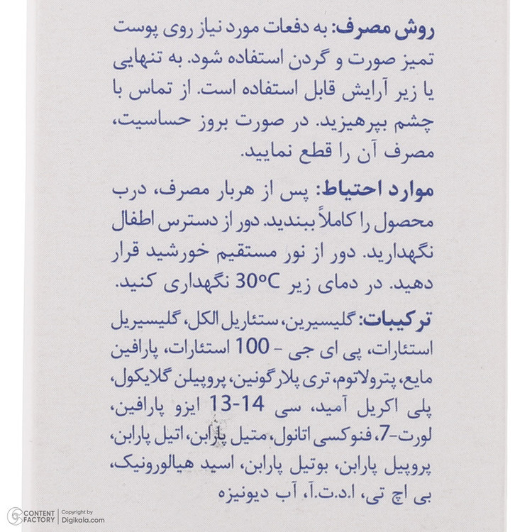 به دفعات مورد نیاز روی پوست تمیز صورت و گردن استفاده شود. به تنهایی یا زیر آرایش قابل استفاده است.
