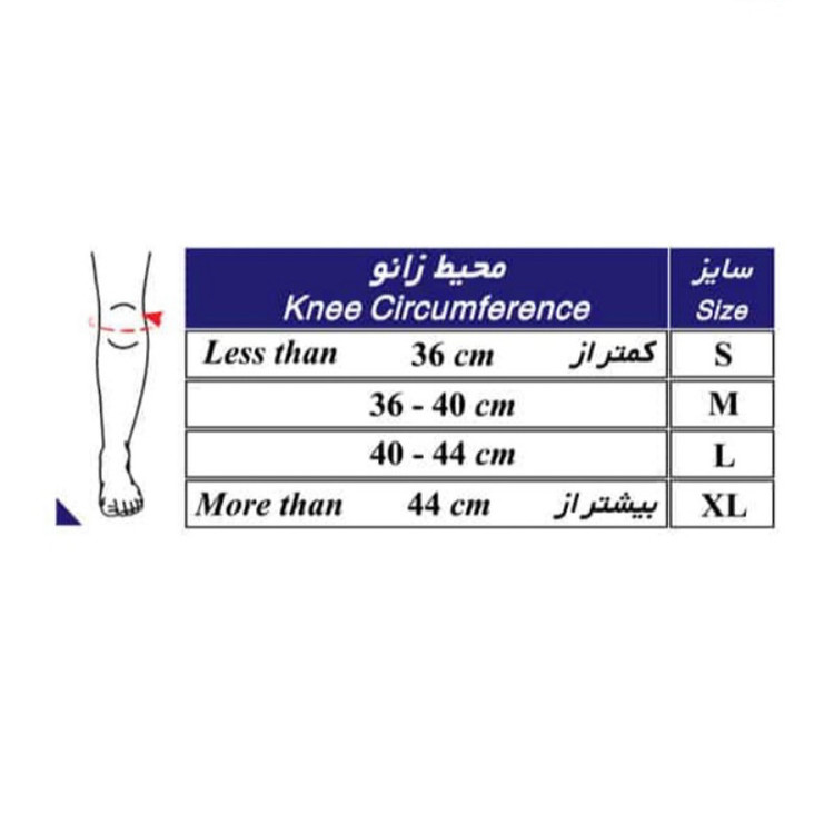 جهت انتخاب سایز محیط زانو را از روی استخوان کشکک با متر پارچه ای اندازه گرفته و بر اساس جدول موجود در تصاویر سایز مناسب را انتخاب نمایید.