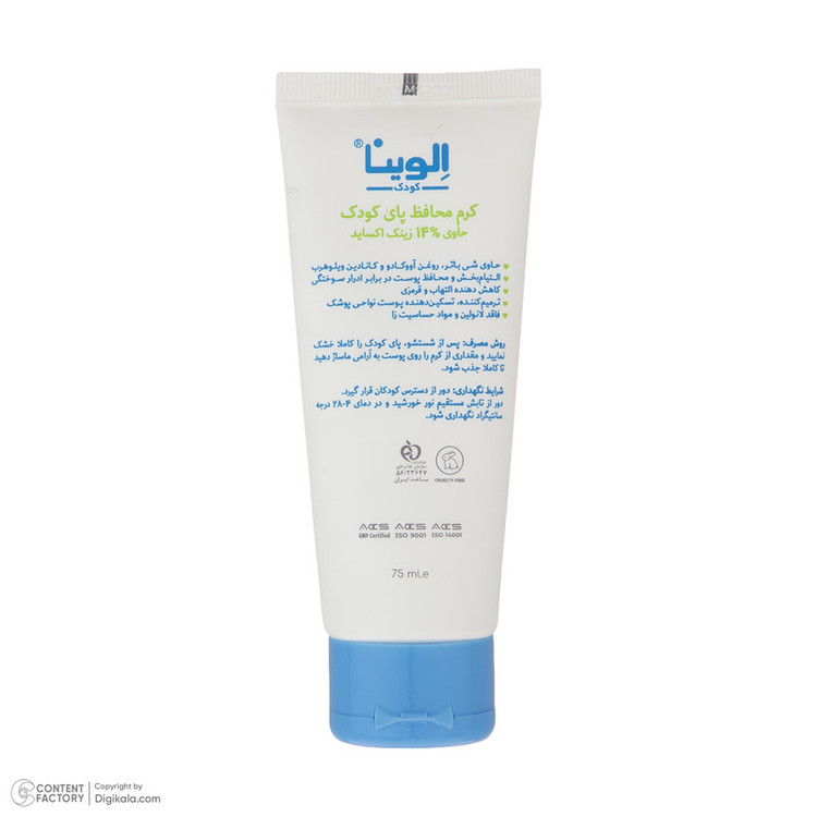 کرم محافظ پای کودک الوینا با دارا بودن 10 درصد زینک اکساید التیام بخش و محافظ پوست پای کودک شما در برابر ادرار سوختگی بوده و کاهش دهنده التهاب و قرمزی نواحی پوشک می گردد.این محصول فاقد پارابن و مواد نگهدارنده و حساسیت زا است.