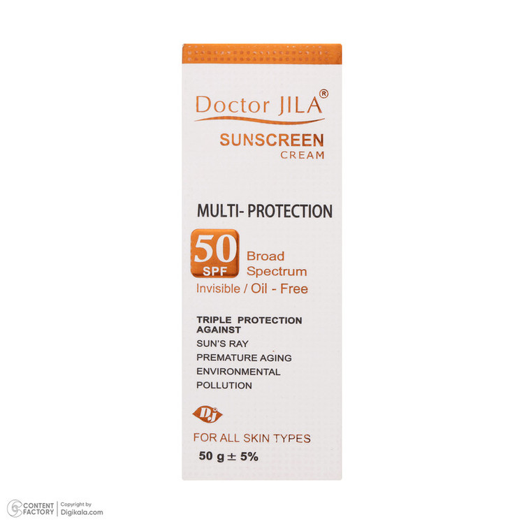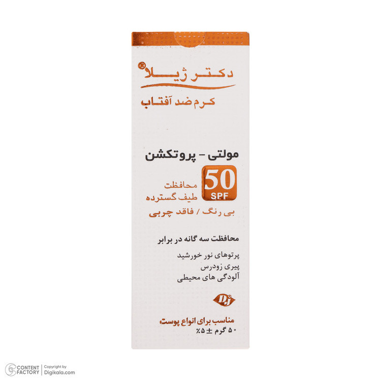 کرم ضد آفتاب مولتی پروتکشن ⁺SPF50 دکتر ژیلا با ایجاد محافظت سه گانه در مقابل پرتوهای نور خورشید، پیری زودرس پوست و همچنین آلودگی های محیطی، نقش مهمی در حفظ جوانی و شادابی پوست ایفا می کند. این کرم علاوه بر جاذب های فیزیکی و شیمیایی گوناگون، حاوی ترکیباتی می باشد که از طریق تاثیر بر روی مسیرهای داخل سلولی، از اثرات مخرب پرتوهای فرا بنفش و آلودگی های محیطی بر روی سلول های پوست جلوگیری می کند. این محصول به علت دارا بودن مجموعه ای از آنتی اکسیدان های قوی، دارای خواص ضد چروک نیز می باشد. نوع بی رنگ این کرم برای استفاده آقایان نیز مناسب است.
