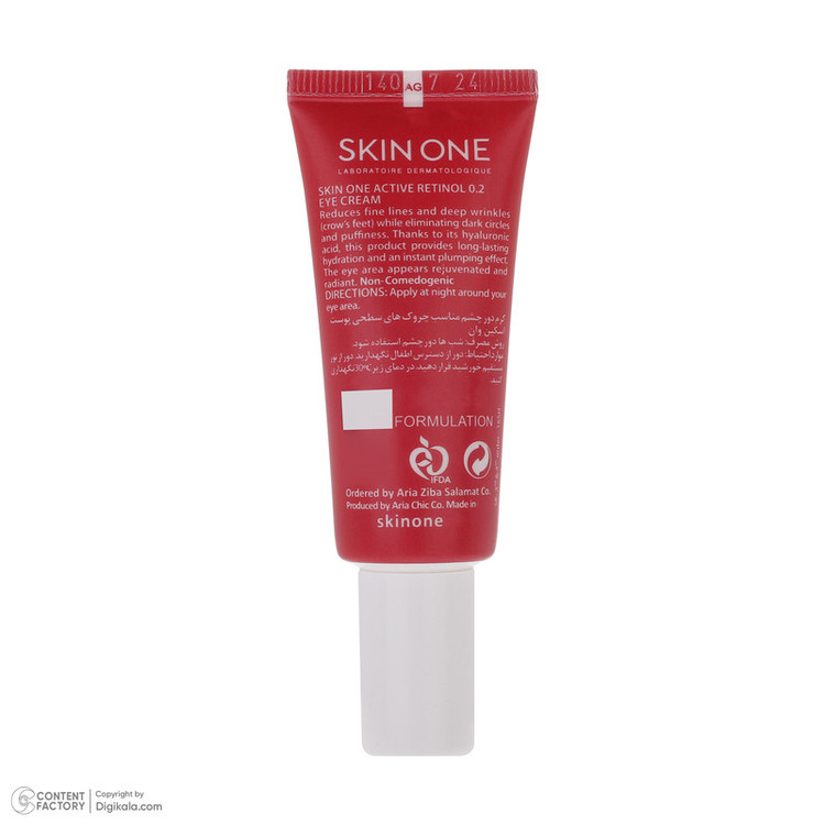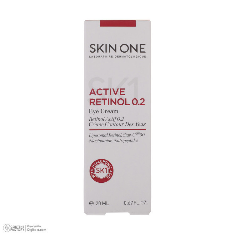 کرم ضد چروک دور چشم اکتیو رتینول 0.2 اسکین وان دارای حجم 20 میلی لیتر میباشد. کرم ضد چروک SKIN ONE، به واسطه ترکیباتی مثل رتینول، اسید هیالورونیک و نیاسینامید علاوه بر کاهش خطوط ریز و چروکهای عمقی پوست سبب رفع پف و تیرگی دور چشم میشود و پوست دور چشم را جوان و شاداب میکند. این کرم دور چشم پرکننده چروکها و خطوط پنجه کلاغی با رتینول فعال است. همچنین به دلیل وجود نیاسینامید در ترکیبات خود، رطوبت رسانی قوی و ماندگاری را برای پوست دور چشم شما به ارمغان می آورد. این محصول آثار خستگی و استرس اطراف چشم را رفع میکند. کرم دور چشم Active Retinol اسکین وان به واسطه داشتن هیالورونیک اسید در ترکیبات خود منجر به کاهش چین و چروکهای عمیق دور چشم می شود. محصول غیر کمدون زا است و مناسب انواع پوست میباشد. کرم دور چشم اکتیو رتینول 0.2 SKIN ONE ساخت ایران است و دارای فرمولاسیون فرانسوی میباشد.