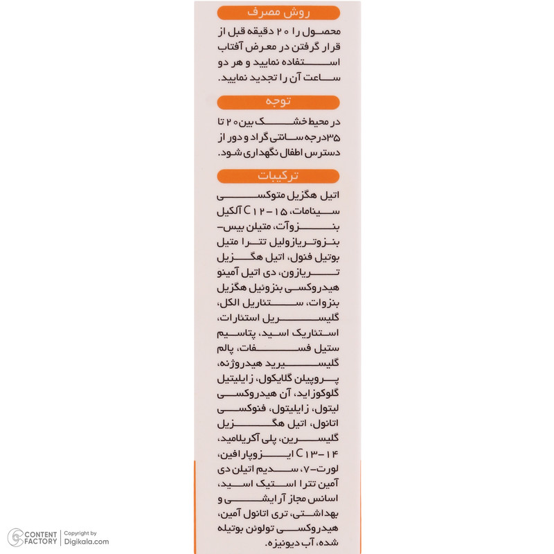 محصول را 20 دقیقه قبل از قرار گرفتن در معرض آفتاب استفاده کنید و هر 2 ساعت آن را تجدید کنید.