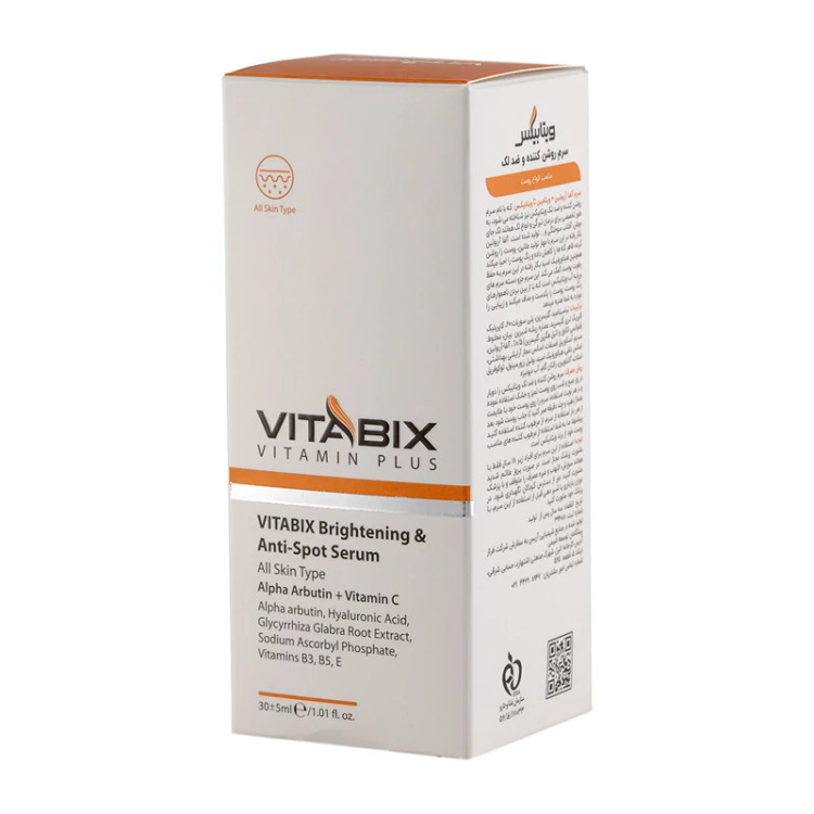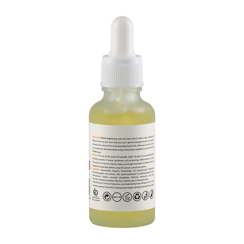 ماهیت: سرم نواحی قابل استفاده: صورت مناسب نوع پوست: انواع پوست حجم: 30 میلی گرم مناسب برای: خانم ها و آقایان ترکیبات موثر: آلفا آربوتین، ویتامین C، عصاره ریشه شیرین بیان، نیاسینامید، گلیسرین نوع محفظه نگهدارنده: شیشه ای قطره چکان دار برند: ویتابیکس مبدا برند: ایران سایر ویژگیها: روشن کننده و شفاف کننده بسیار قوی پوست، آبرسان ، مرطوب کننده ، صاف کننده و نرم کننده قوی پوست، کاهش لک و تیرگی با تاثیر بر تولید ملانین در پوست، یکنواخت کردن رنگ پوست و اصلاح رنگ ناهموار پوست، ایجاد بافتی سبک و زود جذب بدون حس چربی و چسبندگی با فرمولاسیون بر پایه آب، فاقد الکل، گلوتن، پارابن، فرمالدئید، فتالات، روغن معدنی، اکسی بنزون، قطران زغالسنگ، سیلیکون، عطر و سولفات