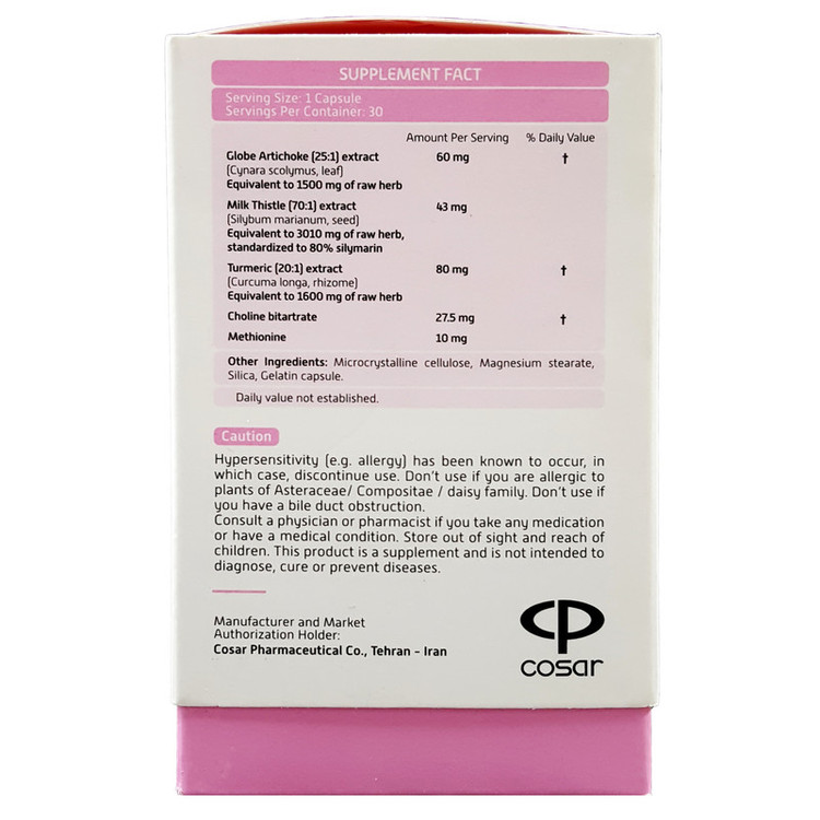 سایر توضیحات: حاوی گیاه خارمریم، کنگر فرنگی، زردچوبه، اسید آمینه متیونین و ماده معدنی کولین