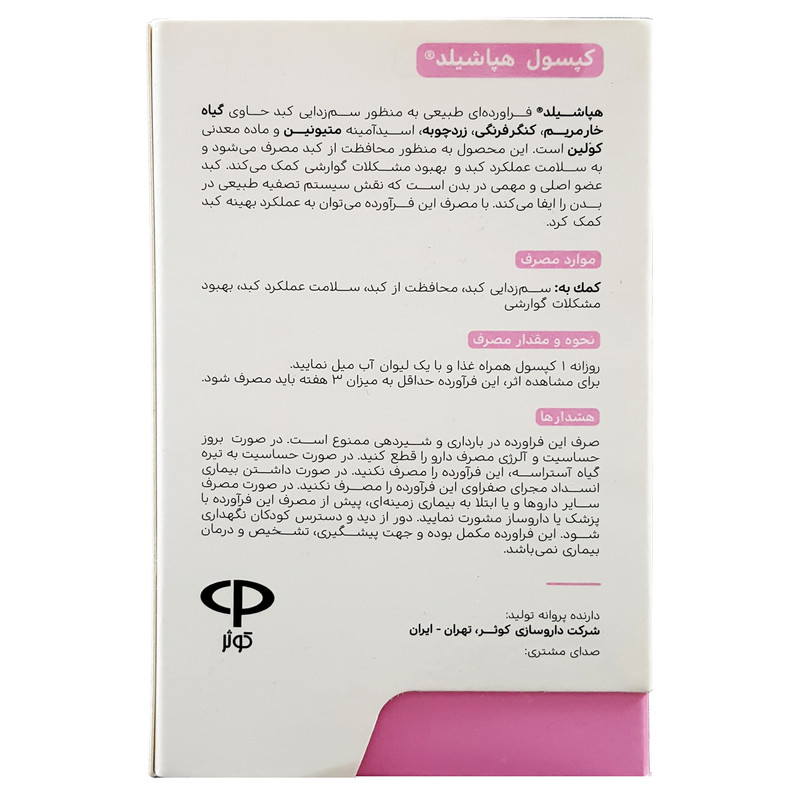 سایر توضیحات: حاوی گیاه خارمریم، کنگر فرنگی، زردچوبه، اسید آمینه متیونین و ماده معدنی کولین