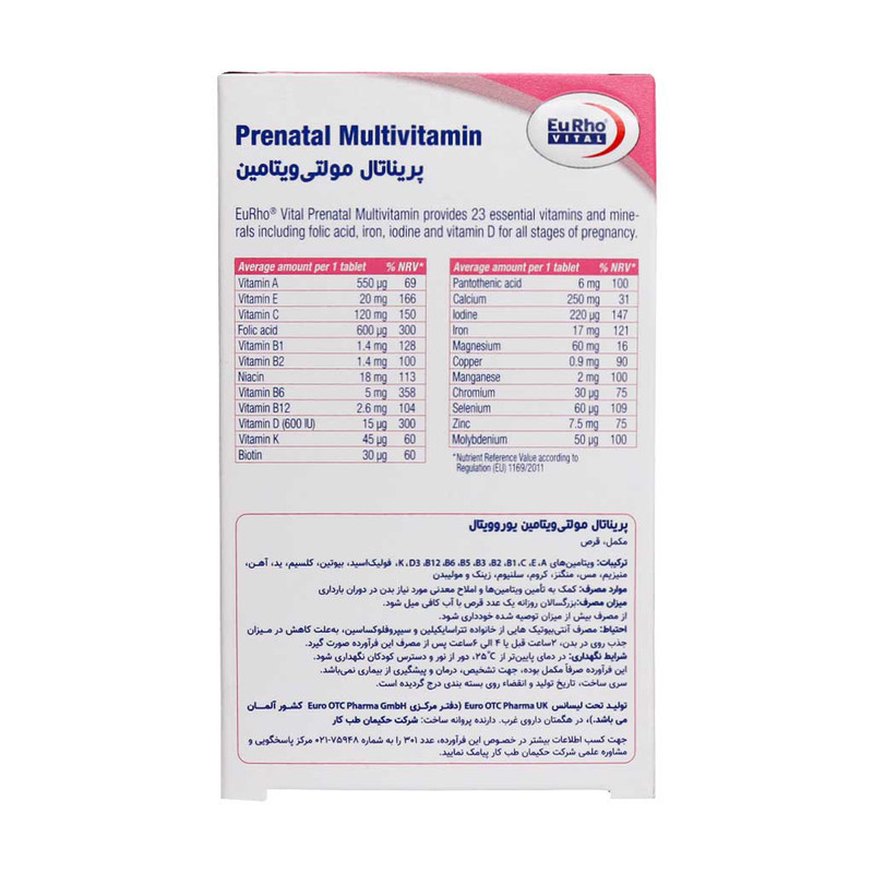 حاوی ویتامین های A، E، C، B1، B2، B3، B5، B6، B12، D3، K، فولیک اسید، بیوتین، کلسیم، ید، آهن، منیزیم، مس، منگنز، کروم، سلنیوم، زینک و مولبیدن کمک به تامین ویتامین ها و املاح معدنی مورد نیاز بدن در دوران بارداری کمک به رشد و نمو طبیعی جنین