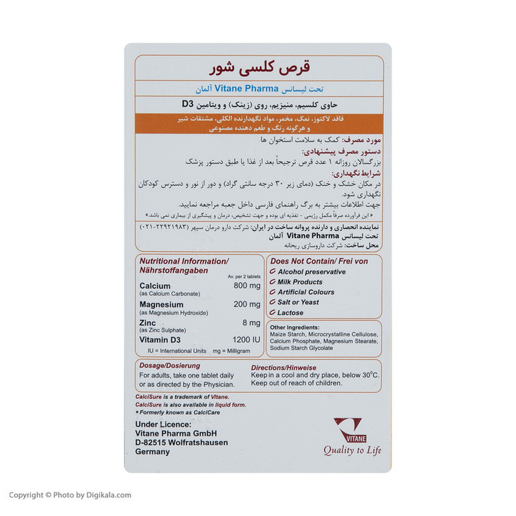 حاوی کلسیم، منیزیم، روی (زینک)، ویتامین D3