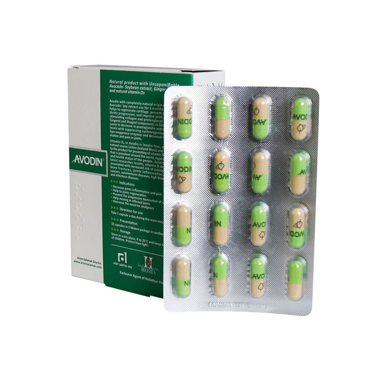 کپسول آوودین هولیستیکا بسته 32 عددی کپسول آوودین هولیستیکا بسته 32 عددی (avodin capsule) یک مکمل تحت لیسانس فرانسه است که با داشتن ترکیبات موثر طبیعی و گیاهی مانند سویا و آووکادو در کنار ویتامینها، میتواند به کاهش دردهای مفصلی و غضروفسازی کمک کند. قرص اودین مدت زیادی است که به فروش میرسد و در دسته بندی مکملهای مخصوص مفاصل، همواره بسیار محبوب بوده است. در ادامه بیشتر در مورد خواص این محصول صحبت میکنیم. ویژگیهای کپسول آوودین کپسول آوودین هولیستیکا بسته 32 عددی در بخشهای مختلف مربوط به مفاصل و استخوانها موثر است و با داشتن ترکیباتی که هر یک فواید متفاوتی دارد، میتواند مجموعهای از خواص را به دنبال داشته باشد: • کاهش دردهای مفصلی • درمان آرتروز و کاهش علایم • درمان گرفتگی مفاصل و کمک به تحرک بدون درد • کاهش التهاب مفاصل و کمک به غضروف سازی • کند کردن روند ساییدگی غضروف و مفاصل ترکیبات موثر کپسول آوودین در فرمولاسیون داروي avodin از ترکیبات گیاهی و ویتامین استفاده شده که میتوانند غضروف ساز بوده و تاثیر خوبی روی سلامت استخوانها داشته باشند: • عصاره آووکادو سویا: هم آووکادو و هم سویا دارای ویتامینها و ترکیبات ضد التهاب مختلف هستند که سبب میشوند قرص آوودین برای دیسک کمر مناسب باشد و به کاهش دردهای زانو و مفاصل هم کمک میکنند. • زنجبیل: زنجبیل یکی دیگر از مواد طبیعی با خاصیت ضد التهاب است. از زنجبیل در شکلهای مختلف برای تخفیف آرتروز و کاهش میزان درد استفاده میشده است و حضور آن در کپسول هولیستیکا بسته 32 عددی هم به بهبود درد مفاصل کمک میکند. • ویتامین دی: یکی دیگر از مهمترین ترکیبات قرص آوودین است که برای جلوگیری از پوکی استخوان ضروری است. این ترکیب همچنین به جذب کلسیم در بدن کمک میکند و به همین دلیل حتی استفاده از كپسول غضروف ساز برای کسانی که کمبود ویتامین دی دارند بیفایده است.