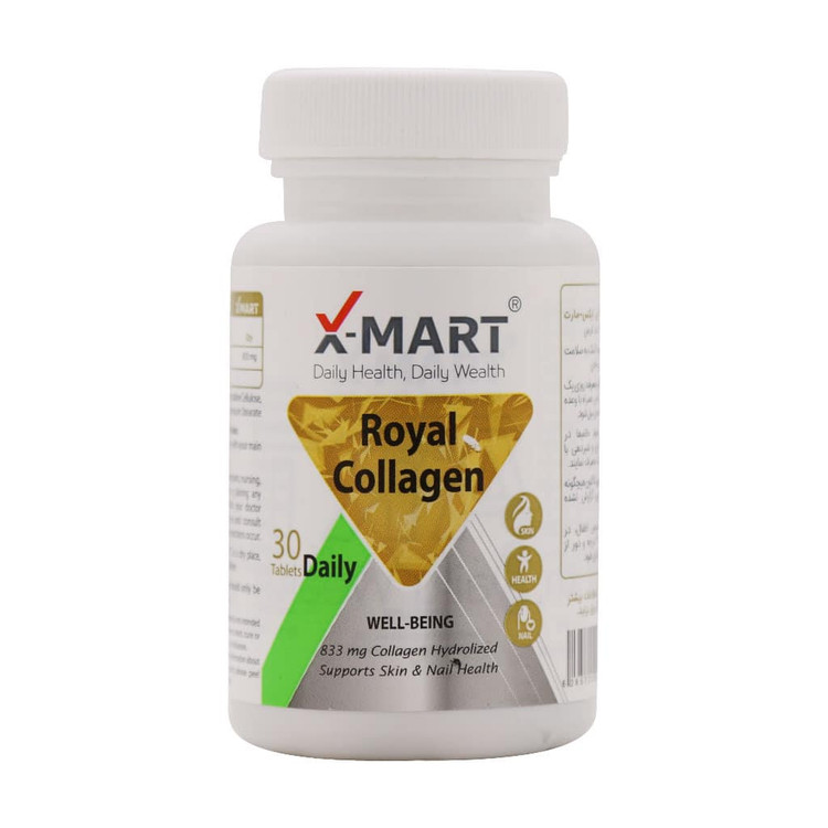 مکمل رویال کلاژن ایکس مارت محصول جدید از سری محصولات ایکس مارت نیکان فارمد است. رویال کلاژن ایکس مارت حاوی 833 میلی گرم کلاژن هیدرولیز شده با کیفیت از نوع 1 و 3 است. در فرآینده هیدرولیزه شدن، کلاژن به قطعات کوچکتر تبدیل میشود تا به راحتی برای بدن قابل جذب باشد. کلاژن اصلیترین ساختار تشکیلدهنده بافت پوست، مو و ناخن است که با افزایش سن، تولید این اکسیر جوانی در بدن کاهش پیدا میکند. کاهش تولید کلاژن از اصلیترین عواملی است که باعث ایجاد نشانههای پیری میشود. قرص رویال کلاژن ایکس مارت با اثرگذاری بالا، روند پیری پوست را متوقف کرده و باعث استحکام پوست، افزایش سرعت رشد و کاهش دفعات شکستگی ناخن میشود. بستهبندی این قرص به صورت 60 عددی است که روزانه یک الی دو عدد از این قرص را همراه با وعده غذایی و معده پر همراه با آب میل نمایید. توصیه می شود خانم ها در دوران بارداری و شیردهی با دستور پزشک مصرف نمایند.