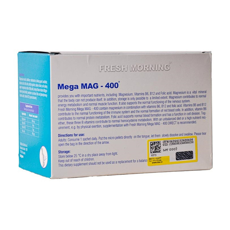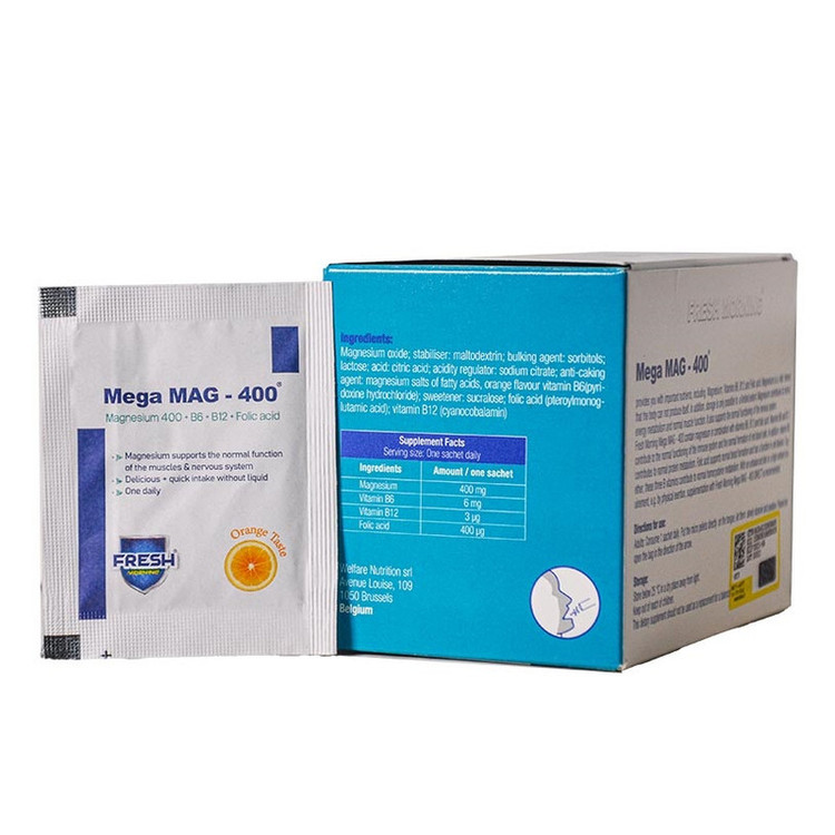 ساشه مگا مگ 400 فرش مورنینگ 30عدد یک مکمل غذایی حاوی منیزیم، ویتامین B6 ، B12 و فولیک اسید می باشد.کمک به حفظ عملکرد طبیعی عضلات و سیستم عصبی، افزایش سطح انرژی و کاهش احساس خستگی و کمک به کاهش خستگی بدن از ویژگی های اصلی این مکمل می باشد.منیزیم نقش اساسی در متابولیسم انرژی دارد و برخی از علائم کمبود آن در عبارتند از گرفتگی عضلات، پوکی استخوان،فشار خون بالا، ضربان قلب نامنظم.این محصول تحت لیسانس Welfare Nutrition می باشد .