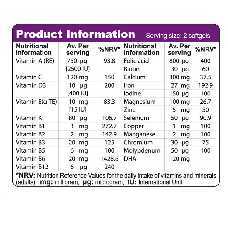 پریناتال پلاس DHA یک مولتی ویتامین مینرال روزانه است که جهت تامین نیازهای تغذیه ای زنان قبل از شروع بارداری، دوران بارداری و همچنین شیردهی طراحی شده است. DHA (دکوزاهگزانوئیک اسید) در رشد بافت عصبی، مغز و چشم جنین مشارکت دارد. DHA در سه ماهه آخر بارداری و ماه های اول زندگی کودک بسیار مهم است. مصرف فولیک اسید قبل و حین بارداری می تواند کمک به پیشگیری از عیوب مغزی و نخاعی نماید. ید در بهبود سیستم مغز و سیستم عصبی نقش بسزایی دارد. ویتامین C در بهبود سیستم ایمنی مشارکت می نماید. در دوران بارداری باید مصرف آهن دو برابر گردد تا بدن بتواند مقدار بیشتری آهن جهت نیاز کودک فراهم آورد.